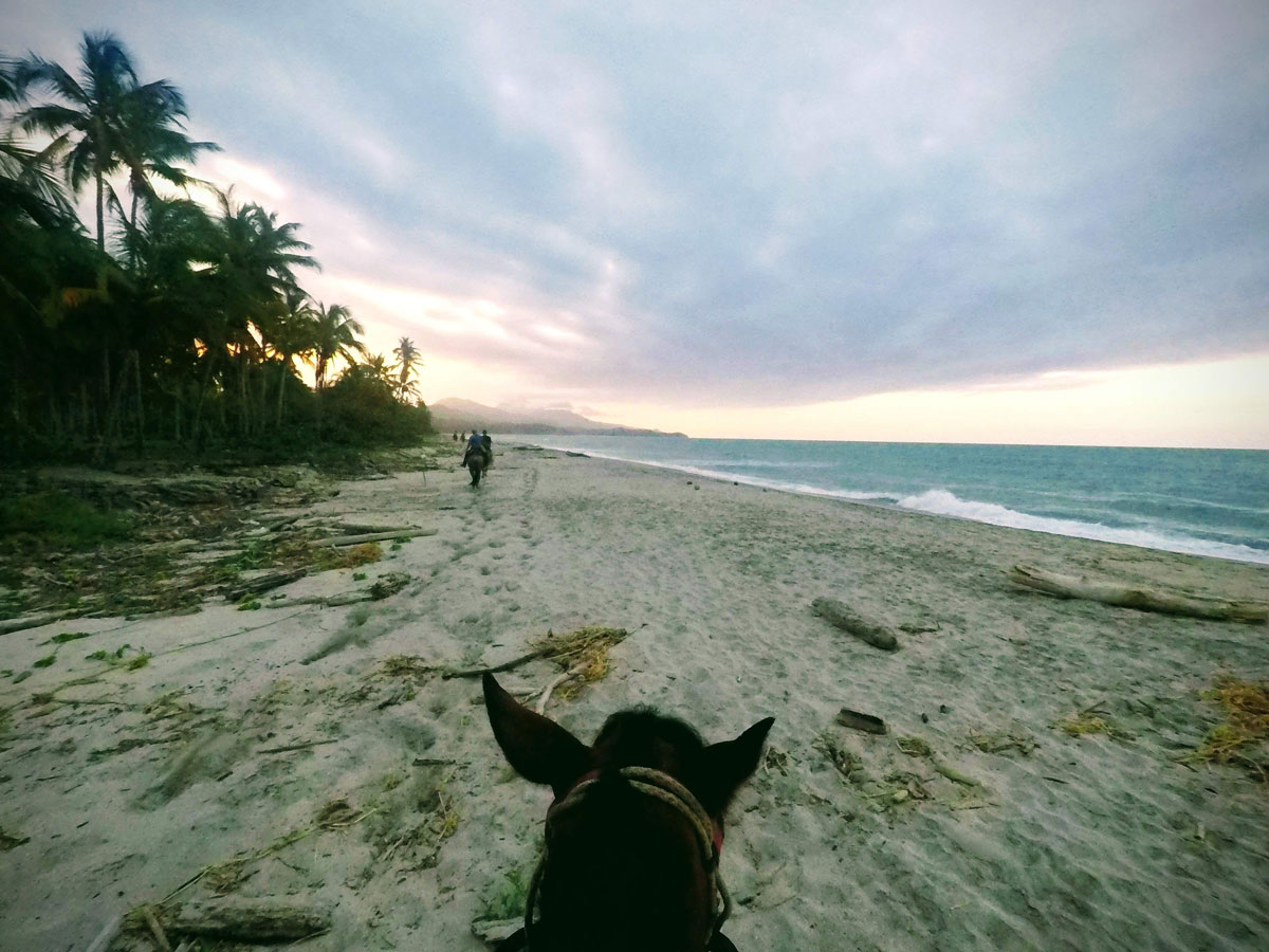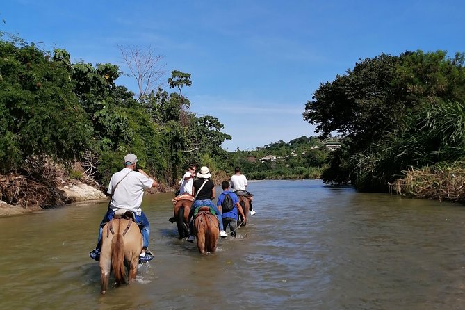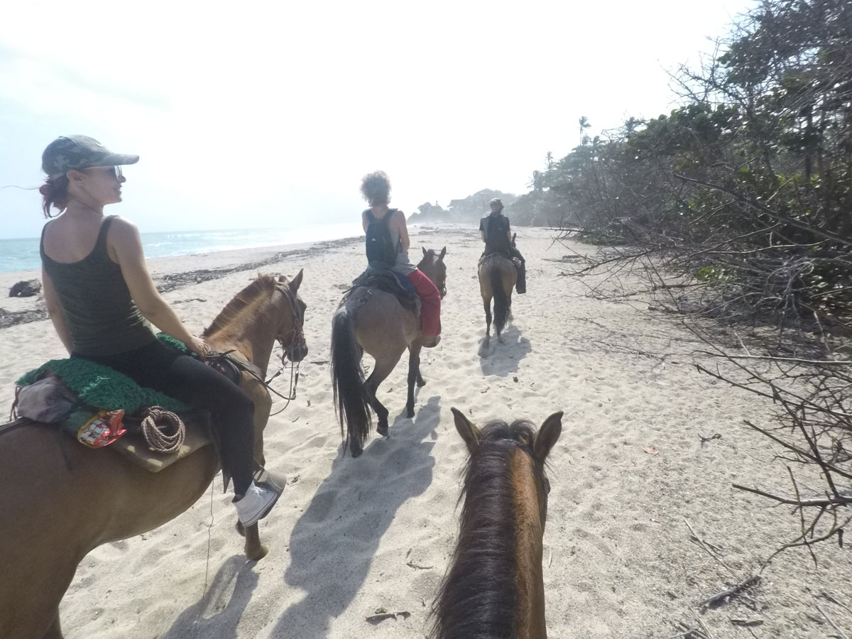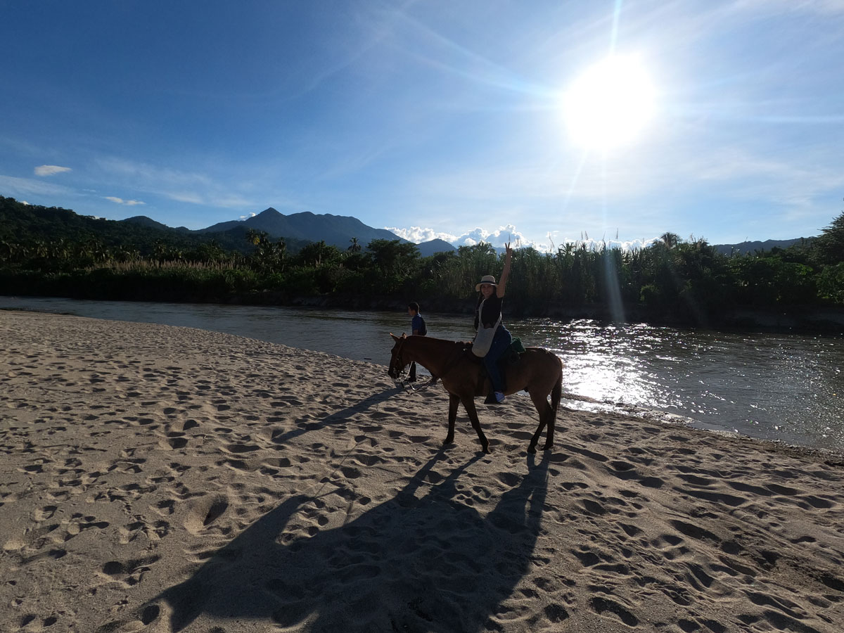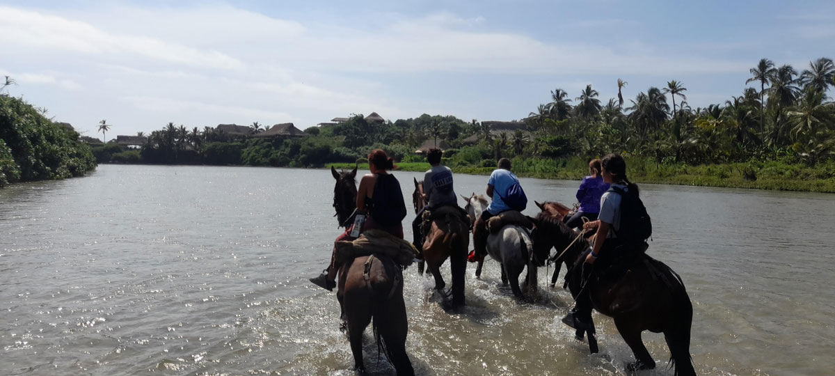El recorrido atraviesa senderos rodeados de vegetación, sigue el cauce del Río Piedras y termina en Playa Los Naranjos, donde los caballos caminan junto al mar.